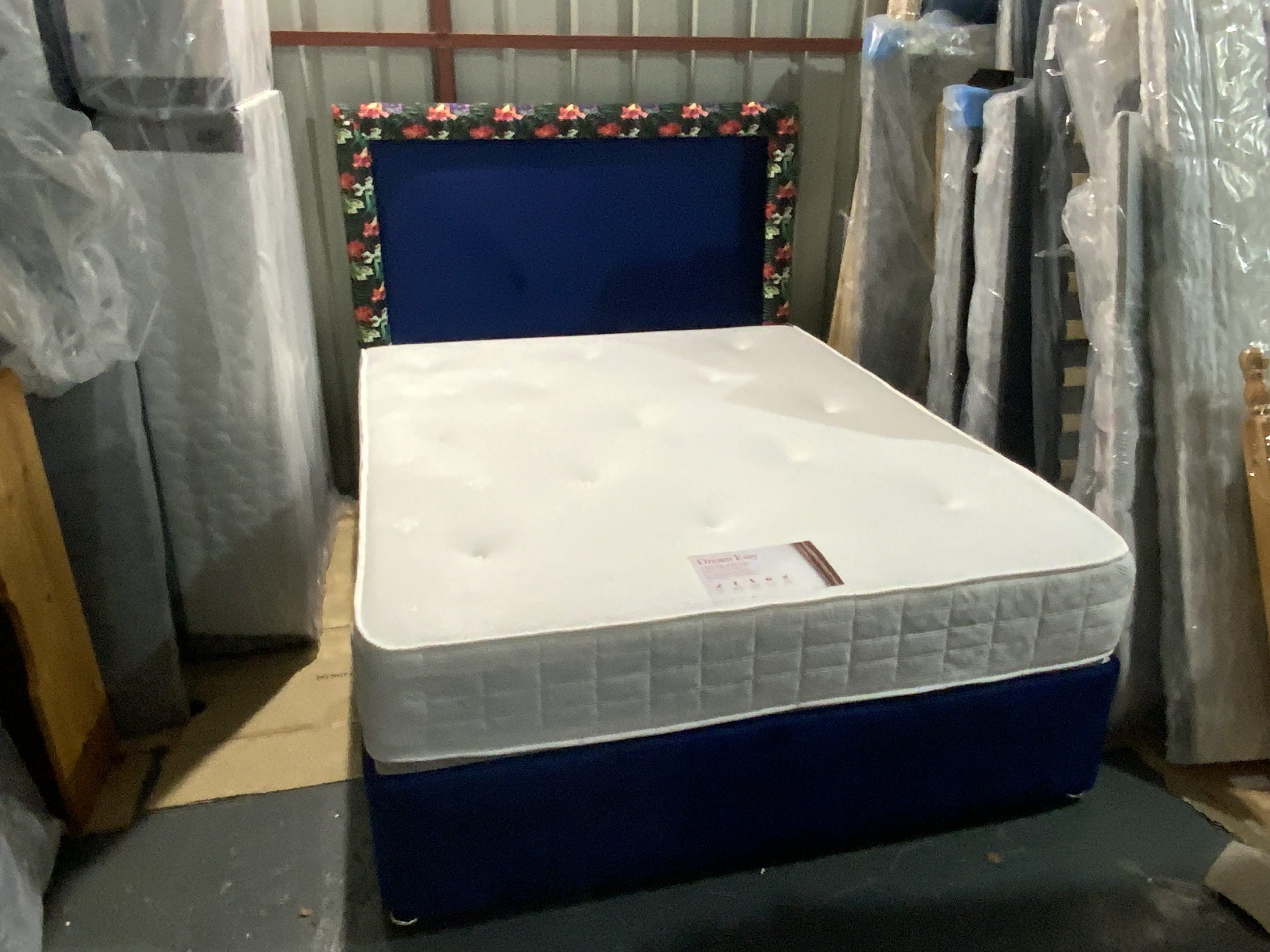 5ft king size royal blue divan bed with headboard +10 inch cool touch mattress