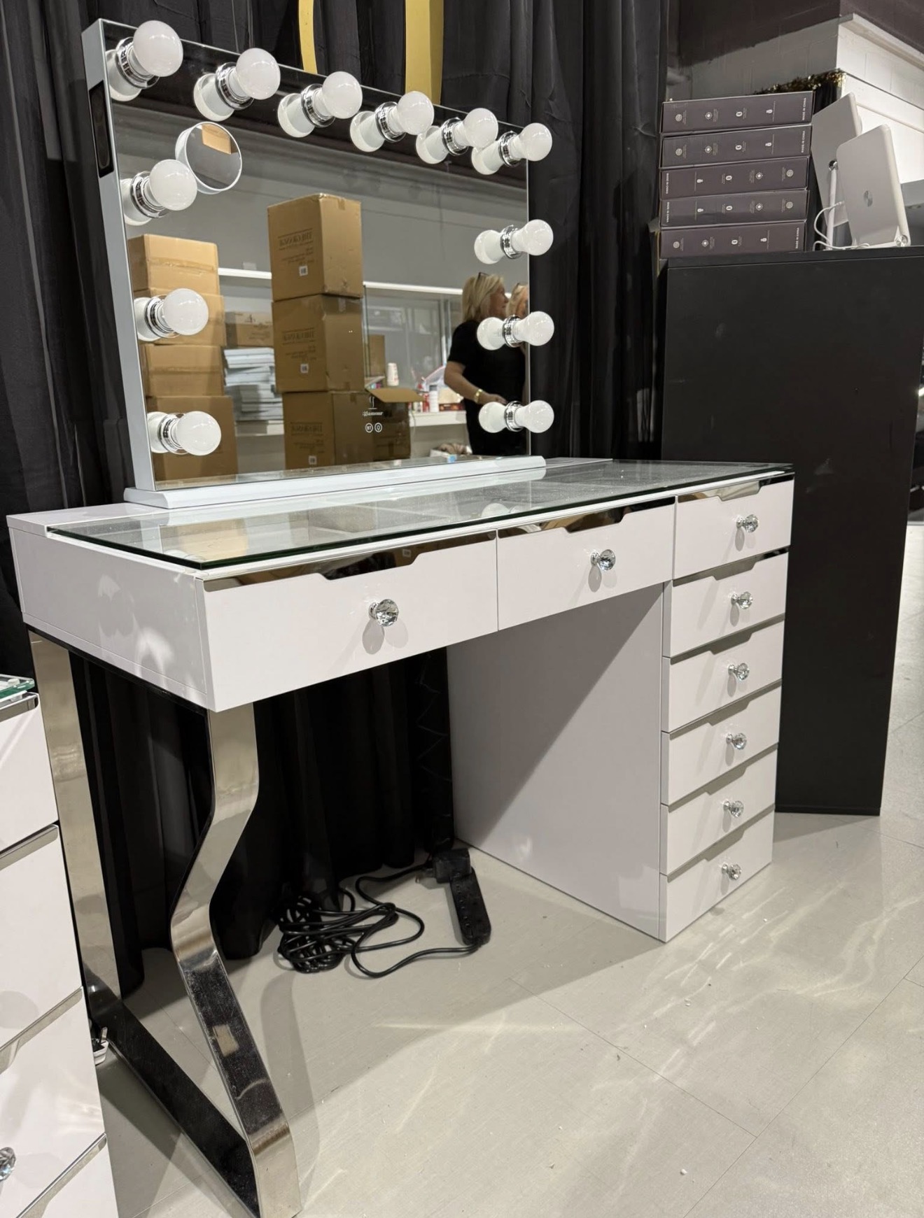 New Hollywood 8 drawer set comes with changeable lights usb ports wireless charger mirror has Bluetooth more usb ports and plug for hairdryer every girl’s dream